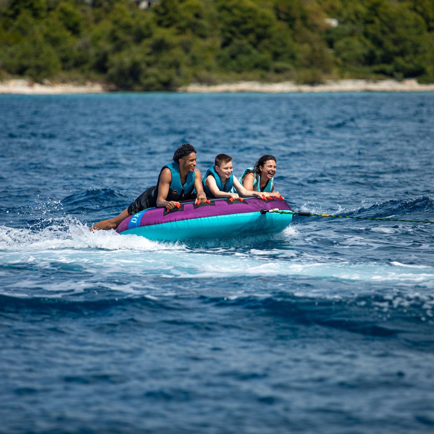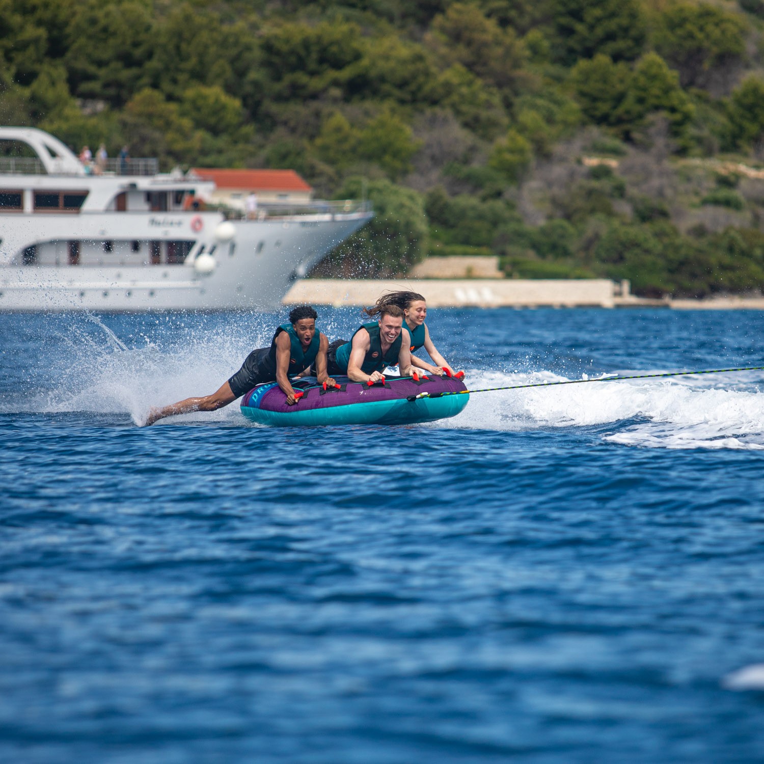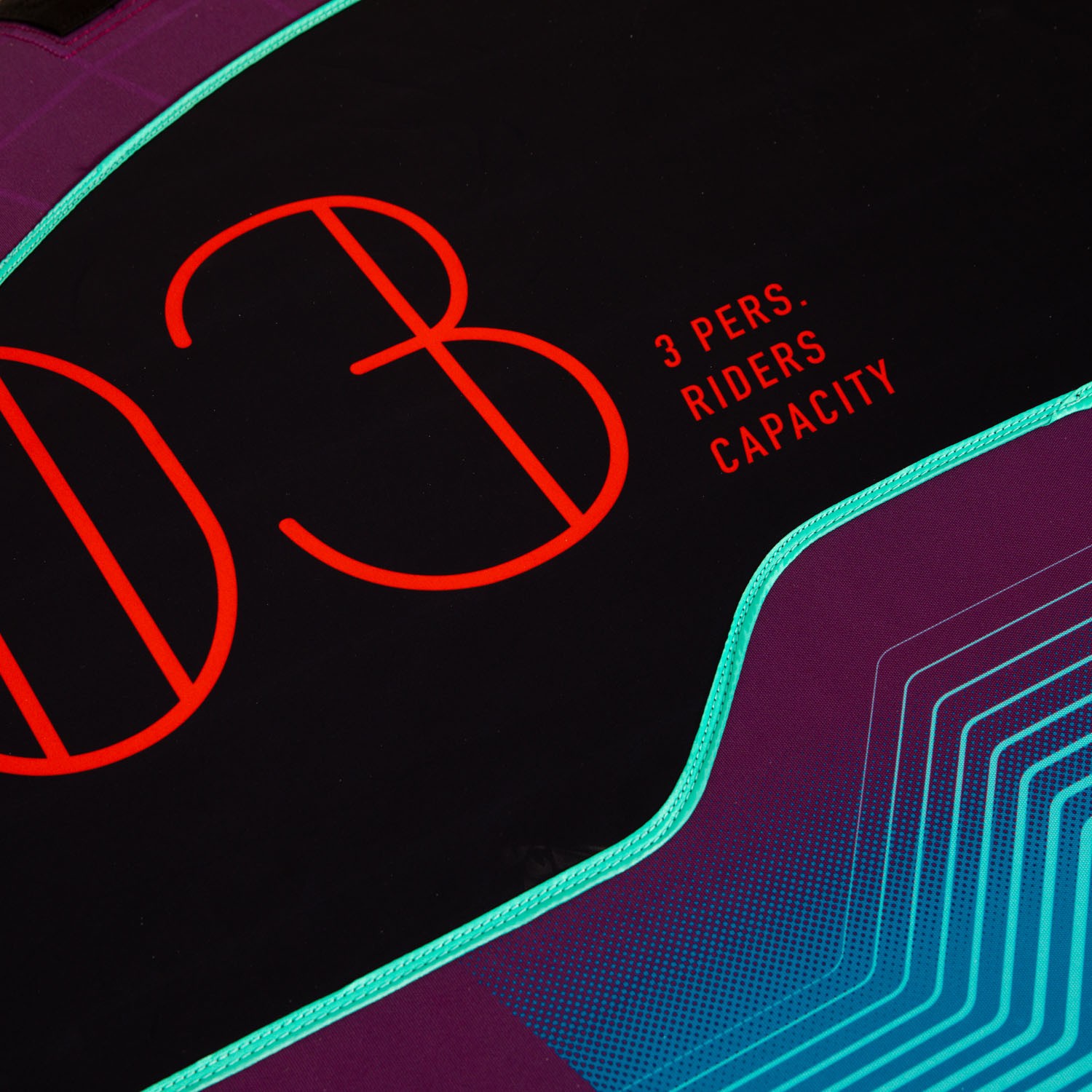 Please get ready. This beast can handle up to 3 thrill seekers. With inners made out of heavy duty 28G PVC, and a 840 denier patterned cover. This is one of our most durable towables. Don't get blown away by the Droplet with it's 6 foam-filled grippy and comfortable deluxe handles to help you get back on your feet...uh belly.