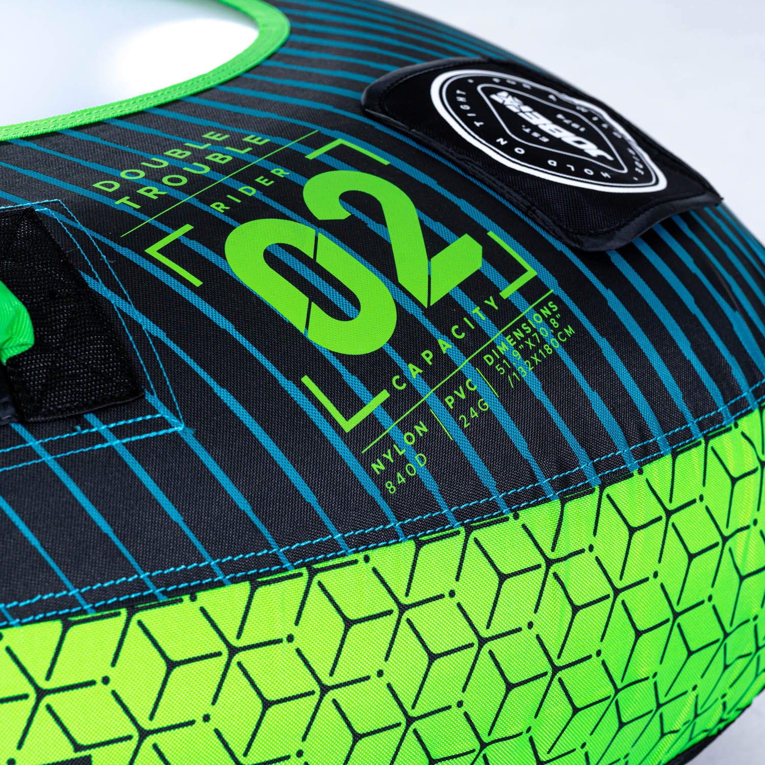 Double Trouble but twice the fun. The Double Trouble towable is our most accessible and affordable 2 person towable. Jobe's double trouble has been built with strong and durable 840D nylon and a 24 gauge PVC bladder and equipped with an easy one way boston valve and quick rope connector.