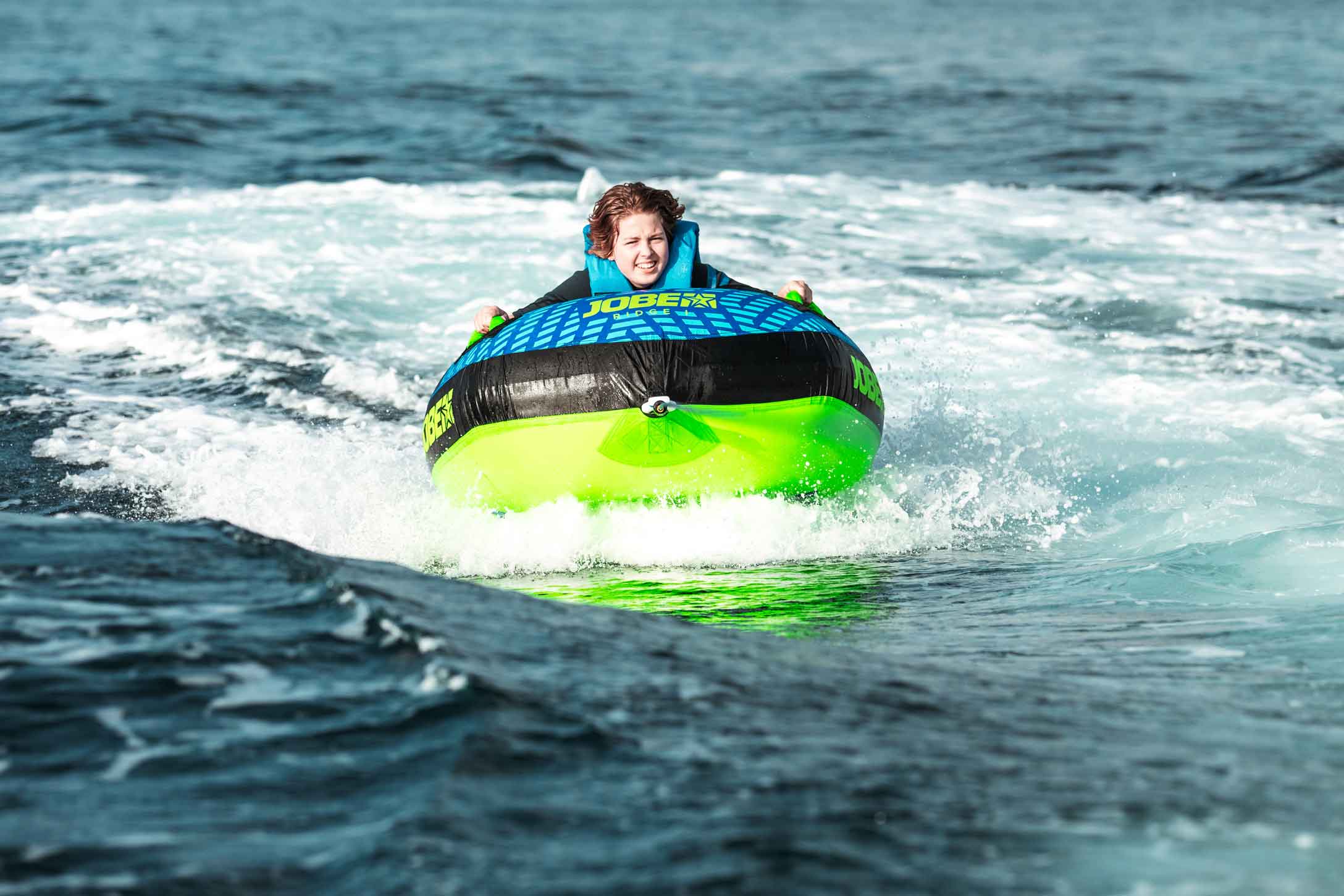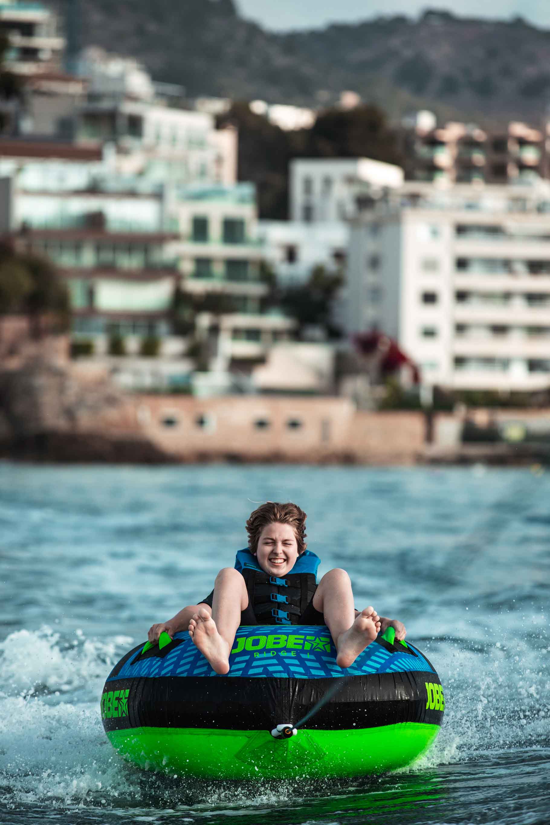 Check out the Ridge 1P. The inner material has been made of heavy duty 24G PVC, which makes this tube strong & light for a lively feeling on the waves. Likewise, the outside has been made of double-stitched 420D to ensure durability and quality. The 4 neoprene knuckle guard handles offer grip and comfort. Connect and disconnect the rope in a flash of a Ridge strike with its quick rope connector. Jobe's Ridge towable has a drain to guarantee good water release after a stormy ride.